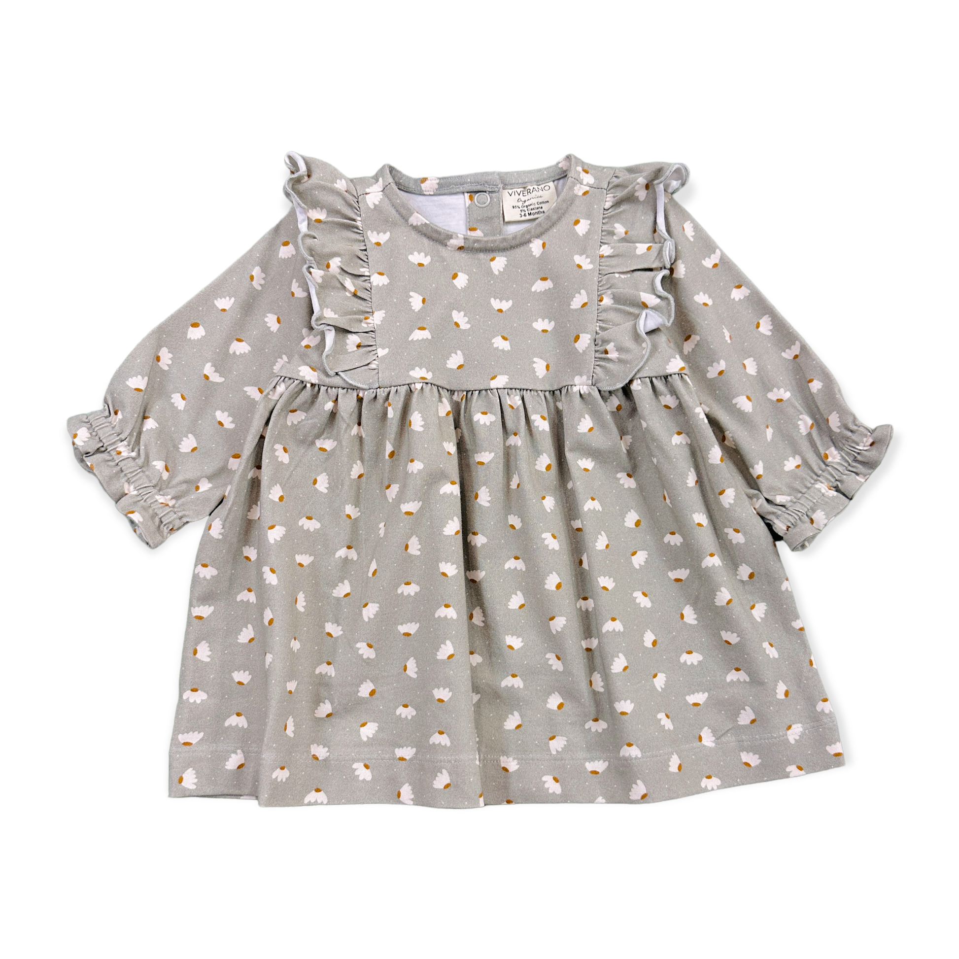 Organic cotton baby girl flare dress with ruffles in front and on the cuffs.