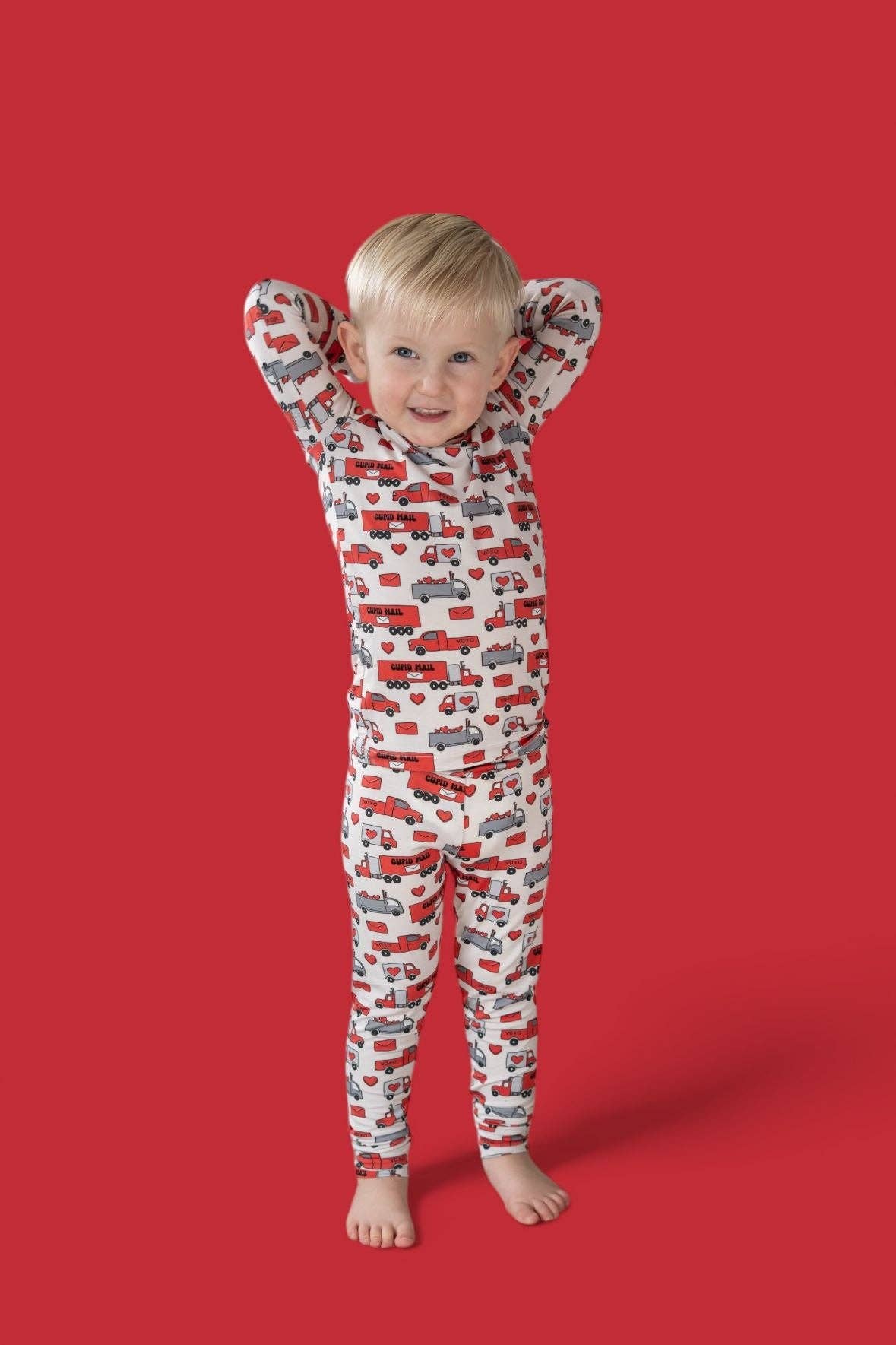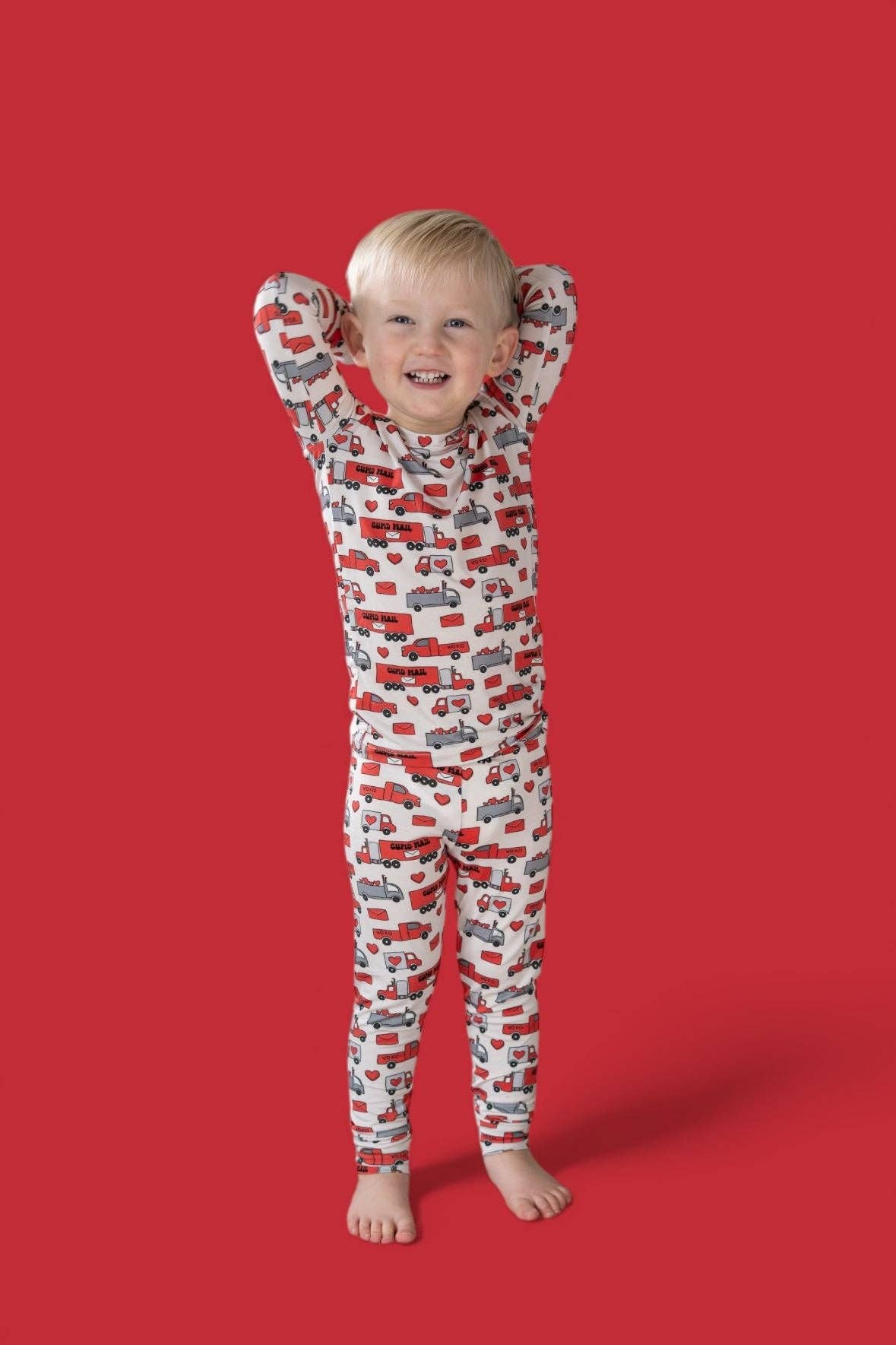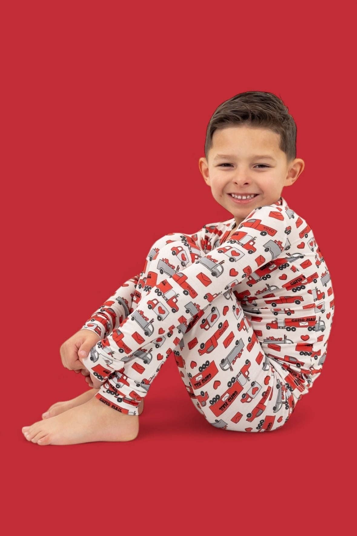 🚚❤️ Haulin’ Hearts Dream Set ❤️🚚 Love on the go, now in a two-piece! The Haulin’ Hearts Dream Set features a long sleeve top and matching pants with a cheerful print of red + gray trucks, letters, and hearts delivering “Cupid Mail.” Crafted from our signature buttery-soft bamboo fabric, this set is breathable, stretchy, and perfect for snuggles, playtime, or drifting into heart-filled dreams. * 🚚 Playful truck + hearts + “Cupid Mail” print * ❤️ Two-piece set: long sleeve top + matching pants * 💕 Buttery-soft, breathable bamboo fabric * 🌙 Gentle on sensitive skin with tagless comfort * 👯 Matching sibling styles available A cozy set built for playtime, bedtime, and delivering lots of love! Machine Wash Cold Material: 95% Bamboo form Viscose; 5% Spandex All DreamyZzz items are snug fit to meet CPSC Compliance.