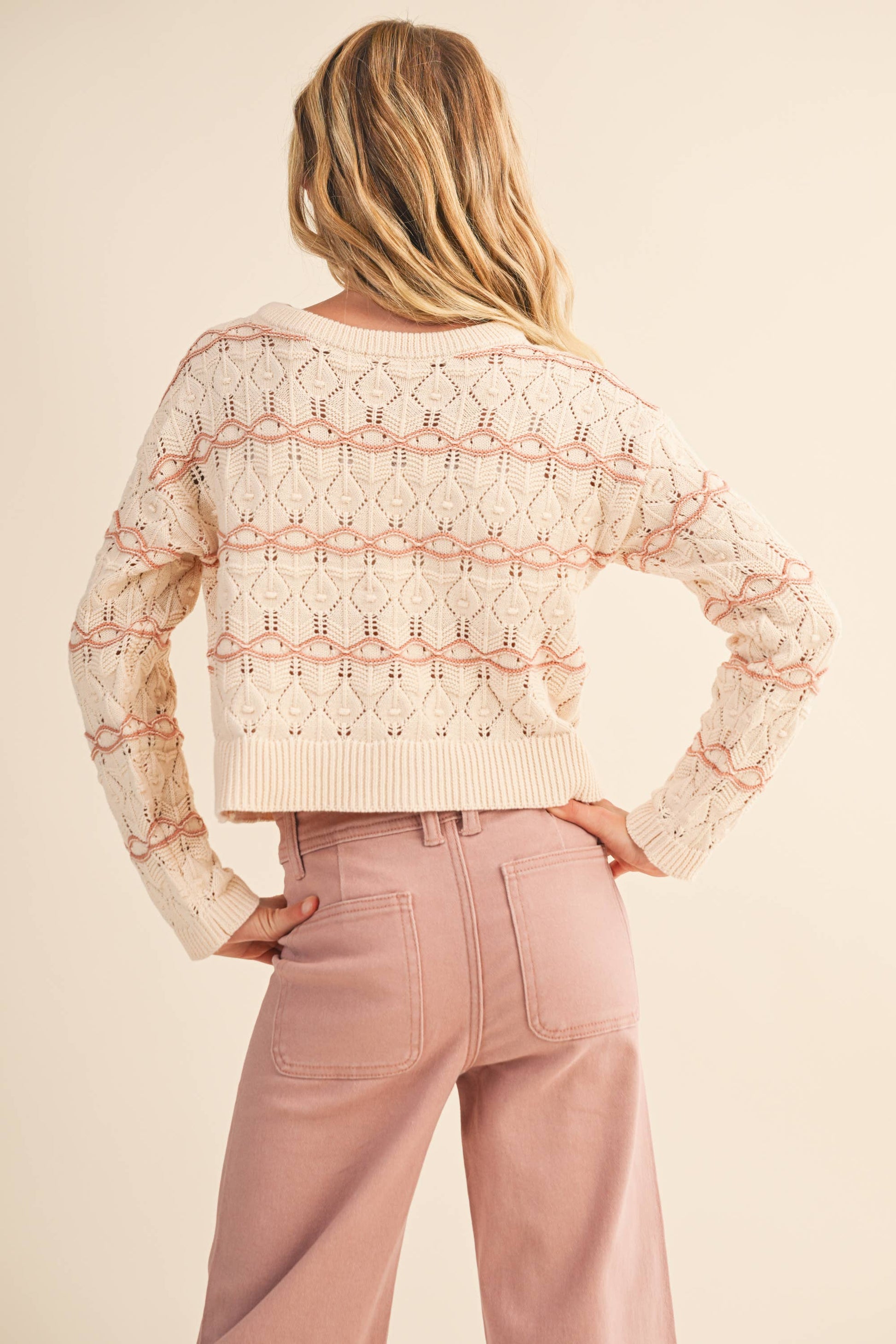 Add a soft, feminine touch to your wardrobe with this cozy knit sweater. Crafted in a warm cream base, it features delicate geometric open-knit detailing with subtle rose-toned stripes woven across the chest and sleeves for a charming accent. Its relaxed, slightly cropped fit makes it perfect for pairing with high-waisted trousers or denim, while ribbed edges at the neckline, cuffs, and hem provide a clean, polished finish.